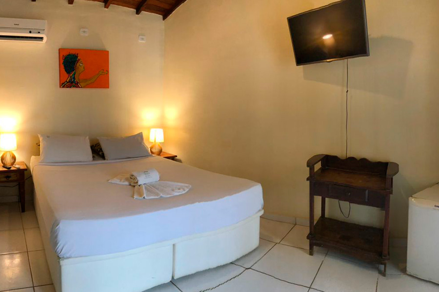 Quarto para 2 pessoas com cama casal queen size. Varanda com vista para a praia.